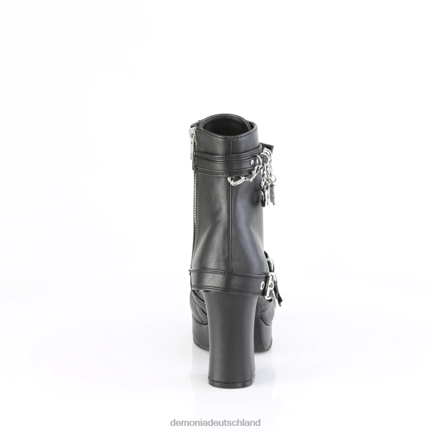 3 3/4 Zoll (95 mm) Absatz, 1 1/4 Zoll (32 mm) Plateau-Schnürstiefel in der Mitte der Wade, oberer Riemen mit Herz-Spinnennetz-Schnalle, D-Ringen, verschiedenen baumelnden Anhängern und Umwickelgurt an der Ferse & Schnalle doppelt