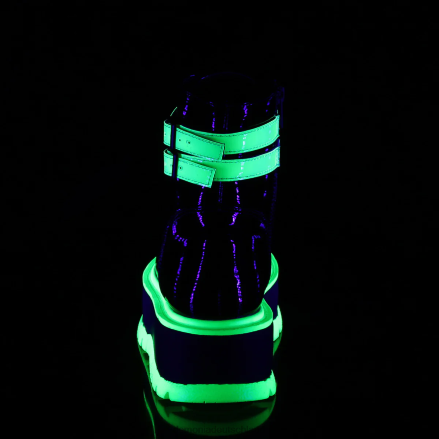 Wir stellen den Slacker-52 vor, einen Stiefeletten, der alles andere als faul ist. Werten Sie Ihre Garderobe mit einem weichen 2-Zoll-Plateau und einer markanten Schnürung vorne auf. Die Knöchelriemen mit zwei Schnallen sorgen für einen Hauch von Rebellion, während der praktische Reißverschluss an der Innenseite für praktischen Komfort sorgt. aber der wahre Showstopper Der Stiefel verfügt über eine schwarze, UV-irisierende grüne Oberfläche, die bei jedem Schritt das Licht und die Blicke einfängt. Perfekt zum Ausgehen oder um Ihrem Alltagslook einen Hauch von Außergewöhnlichem zu verleihen.