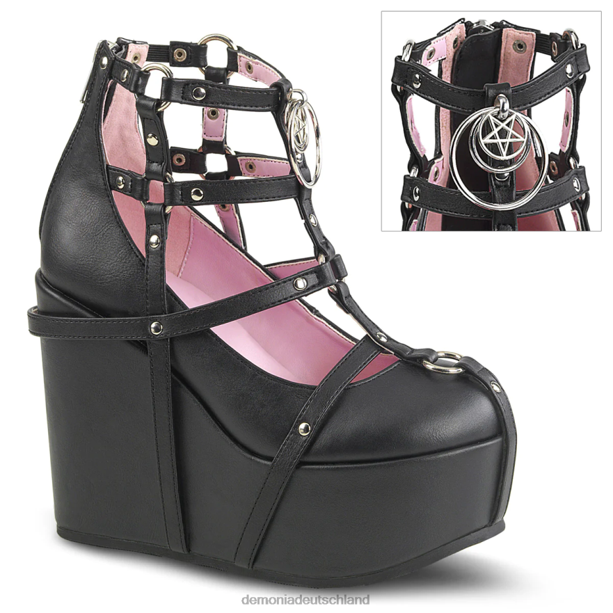 Gehen Sie mit Zuversicht in die Nacht Der Poison-25-1, der ultimative Cage-Stiefel mit Keilplateau für alle, die es wagen, aufzufallen. Verziert mit dynamischen Nieten und vielseitigen O-Ringen, abgerundet mit einem bezaubernden Pentagramm-Anhänger, sind diese Stiefel ein Statement der Stärke. Sie bestehen aus glattem schwarzem veganem Leder und sind sowohl gewissenhaft als auch schick. Perfekt für den modernen Maven, der bereit ist, jede Szene mit Stil und Seele zu erobern.