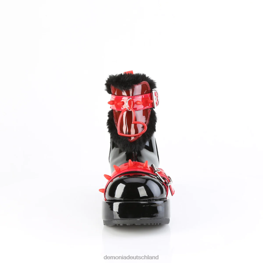 2 3/4 Zoll (70 mm) Plateau-Stiefelette mit pelzgefüttertem Vinyl-Herzschild mit Schnallenverschluss und Gummi-Spike-Gürtel oben und unten mit hängendem Herzringdetail am D-Ring des oberen Riemens und Zuglasche hinten