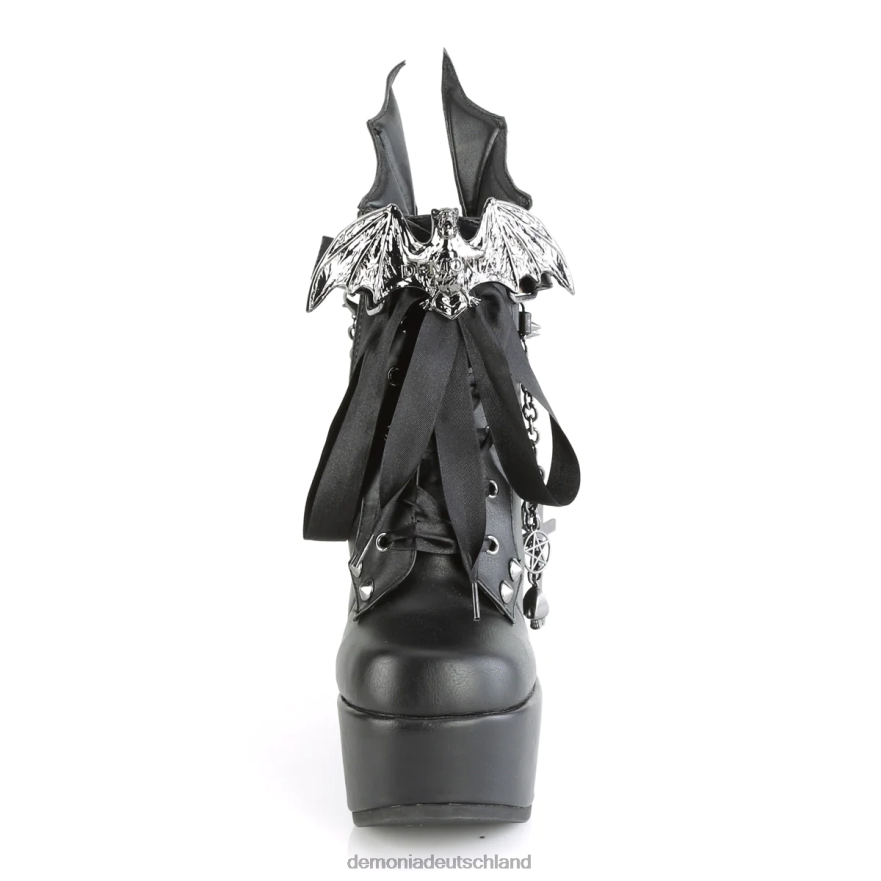 5-Zoll (127 mm) keilförmige Plateau-Stiefelette mit Schnürung vorne, umlaufenden Nieten- und Spike-Riemen mit Fledermausschnallen-Detail, Kette mit verschiedenen Anhängern zum Aufhängen und Fledermaus-Detail auf der Rückseite, innenliegender Metall-Reißverschluss
