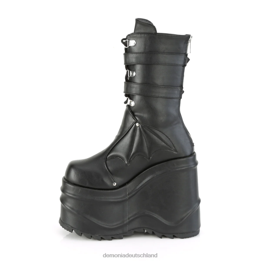 6 Zoll (152 mm) keilförmiger Plateau-Schnürstiefel in der Mitte der Wade mit gestepptem Fledermausflügel-Design am Vorderblatt und 2 Fledermausschnallen-Knöchelriemen, hinterer Metallreißverschluss