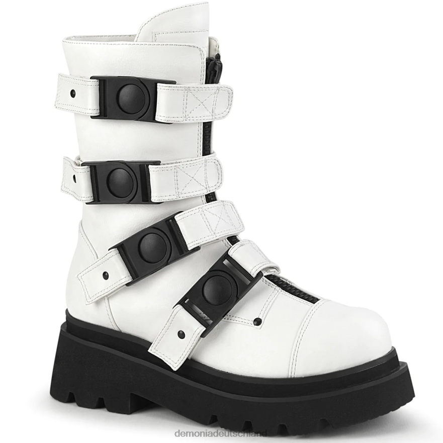 2 1/2 Zoll abgestufter, wadenhoher Riemchenstiefel mit Plateausohle und Schnellverschlussriemen aus Kunststoff, Metallreißverschluss vorne in der Mitte