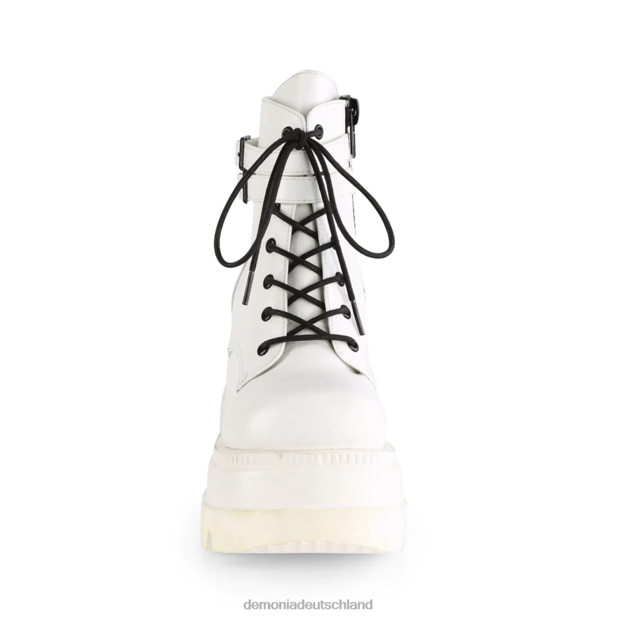 fügen Sie einen Hauch von hinzu Bringen Sie mit unseren weißen Stiefeletten aus veganem Leder der Marke Shaker-52 eine ausgefallene Eleganz in Ihre Garderobe. Mit einer auffälligen 4 1/2-Zoll-Keilplattform bieten diese Stiefel eine bequeme und dennoch gewagte Option für jedes minimalistische oder grungige Outfit. Mit Schnürung vorne und doppelten Knöchelriemen mit Schnalle bieten diese Stiefel bei jedem Schritt sowohl Stil als auch Funktion. Kombinieren Sie es mühelos mit Ihren dunklen Lieblingsjeans, Ihrem Lieblingsrock oder Ihren Lieblingsleggings und lassen Sie diese Stiefel für sich ein Statement setzen. Dank des Innenreißverschlusses sind sie ideal für alle, die schnell und effizient in ihre Schuhe schlüpfen und ausziehen müssen. Perfekt für den modernen Rebellen, der sowohl mutig als auch schick sein möchte.