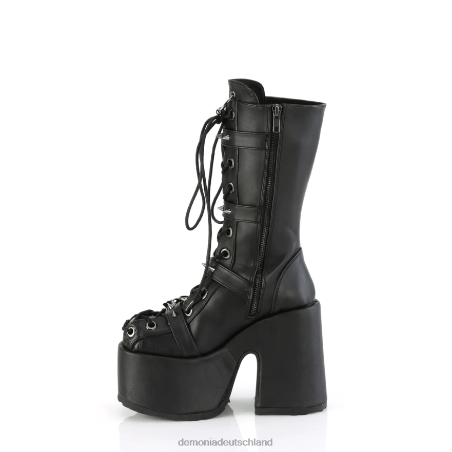 Heben Sie sich mit dem auffälligen und kantigen Camel-115-Stiefel von der Masse ab. Dieser mittelhohe Schnürstiefel hat einen Korsett-Stil mit einem 5-Zoll-Blockabsatz und einer 3-Zoll-Plattform für beeindruckende Höhe und Stabilität. Der mit Stacheln versehene Totenkopf-Schnallenriemen, der O-Ring und die Hufeisendetails auf der Zunge verleihen dem Camel-115 eine zusätzliche Note. Der hintere Reißverschluss erleichtert das Anziehen dieser Stiefel und macht Sie bereit, Ihren Look zu rocken. Diese aus schwarzem veganem Leder gefertigten Stiefel sind perfekt für den bewussten Modeliebhaber, der ein dramatisches Modestatement abgeben möchte.