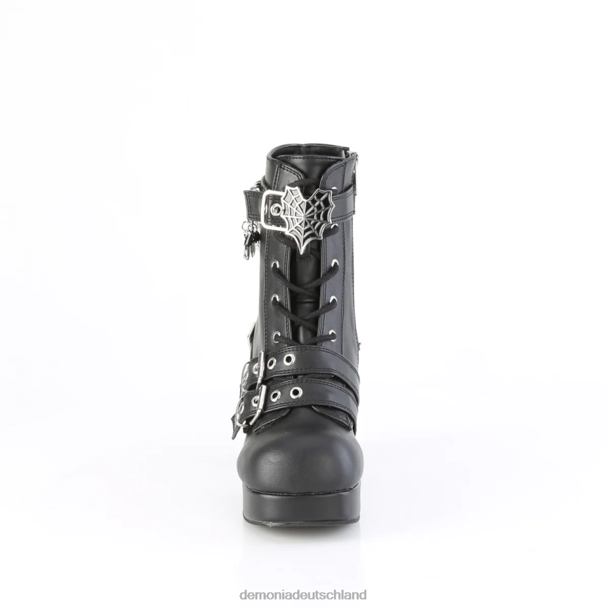 3 3/4 Zoll (95 mm) Absatz, 1 1/4 Zoll (32 mm) Plateau-Schnürstiefel in der Mitte der Wade, oberer Riemen mit Herz-Spinnennetz-Schnalle, D-Ringen, verschiedenen baumelnden Anhängern und Umwickelgurt an der Ferse & Schnalle doppelt