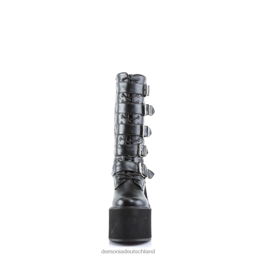5 1/2 Zoll (14 cm) Keilabsatz-Cyber-Punk-Wadenstiefel mit 5 Schnallen und durchgehendem Reißverschluss aus schwarzem Kunstleder