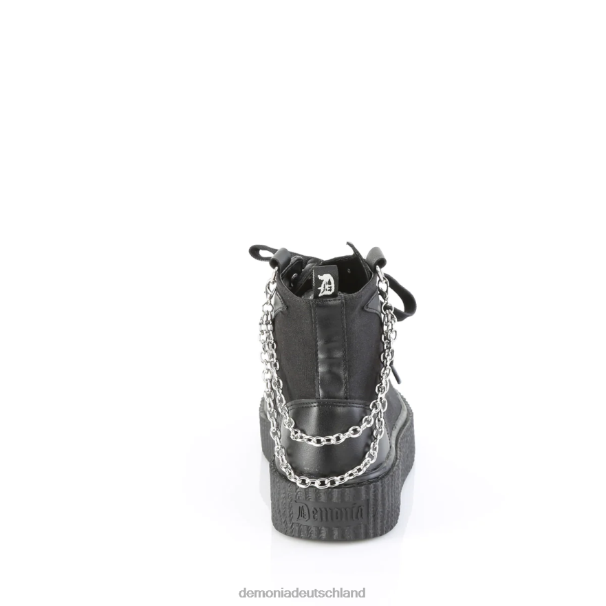 1 1/2 Zoll (38 mm) Plateau-Creeper-Sneaker mit Gummisohle und runder Spitze, hoher Schaft, Schnürung vorne, kontrastierendes Fledermausdetail an den Seitenwänden und der Zunge, abgestuftes hängendes Kettendetail