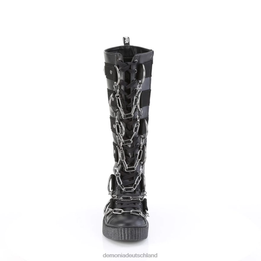 1 1/2 Zoll (38 mm) Plateau-Gummisohle, runde Zehenpartie, Schnürung vorne, kniehoher Creeper-Sneaker-Stiefel mit gestreiften, kontrastierenden Seiteneinsätzen mit D-Ringen und abnehmbaren hängenden Kettendetails, übergroße Pyramide auf