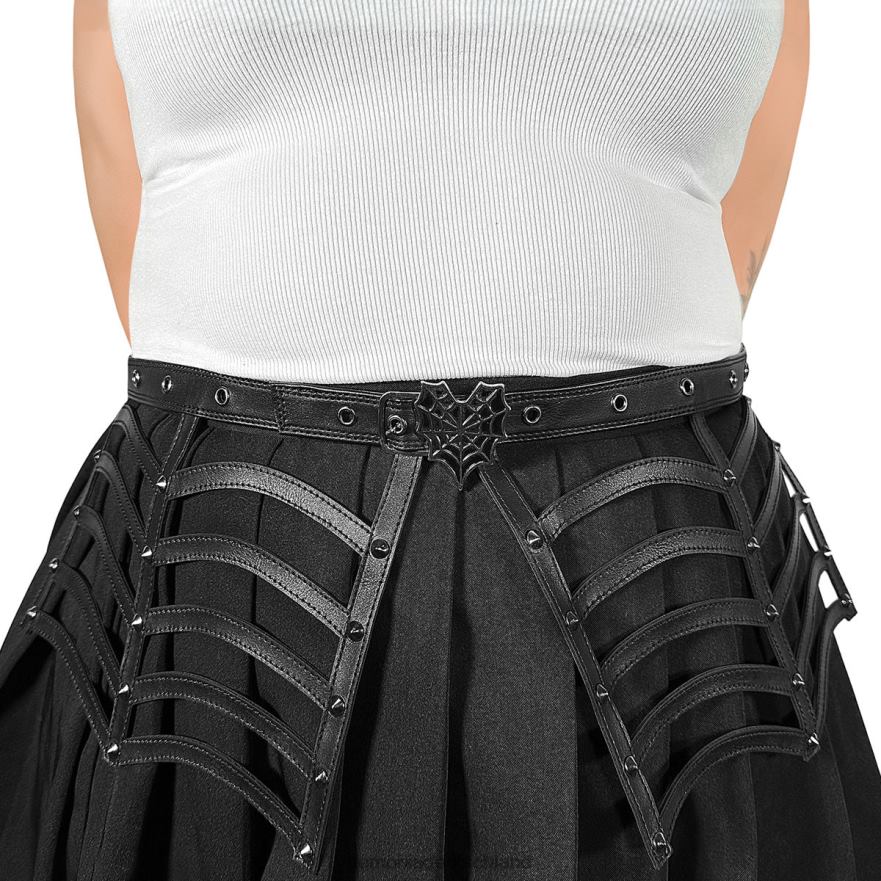 Gürtel aus Kunstleder mit Spinnennetz-Ausschnitt, verziertem Spinnenherznetz vorne in der Mitte, geöstem Riemen oben und Nietendetails in Kegelform, verstellbare Schnalle hinten