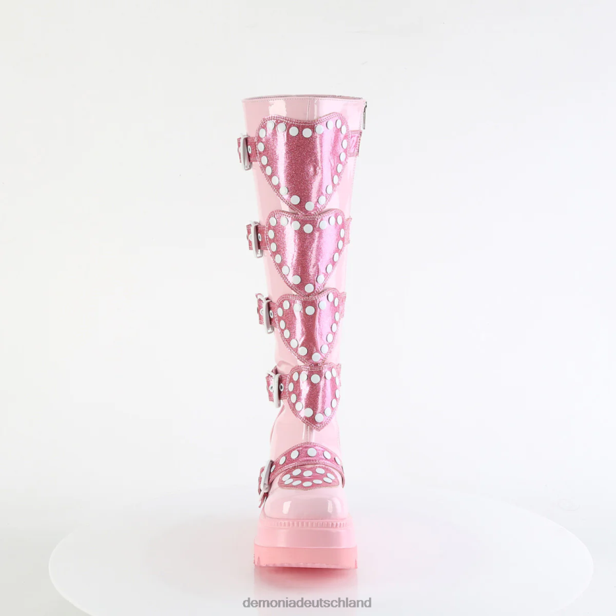 4 1/2 Zoll (114 mm) kniehoher Plateaustiefel mit Keilabsatz und Schnalle in der Mitte des Herzschilds mit runden Nietendetails und seitlichem Metallreißverschluss an der Innenseite