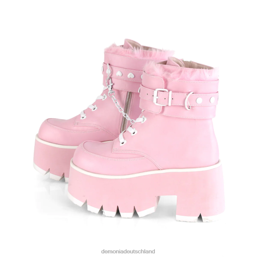 Umarmen Sie Ihre sanfte und gewagte Seite mit der Stiefelette Ashes-57. Heben Sie sich durch einen 3 1/2 Zoll großen Blockabsatz und ein 2 1/4 Zoll großes Plateau mit Cut-Outs hervor, komplett mit Herz-Ösen-Schnürschuhen. Diese babyrosa Schönheiten aus veganem Leder verfügen über einen zusätzlichen Hauch von Rebellion: mit Fell gefütterte, verstellbare und abnehmbare Knöchelmanschetten, die mit Herznieten verziert sind. Das D-Ring- und Kettendetail sorgt für einen kantigen Twist und sorgt dafür, dass Sie überall einen bleibenden Eindruck hinterlassen.