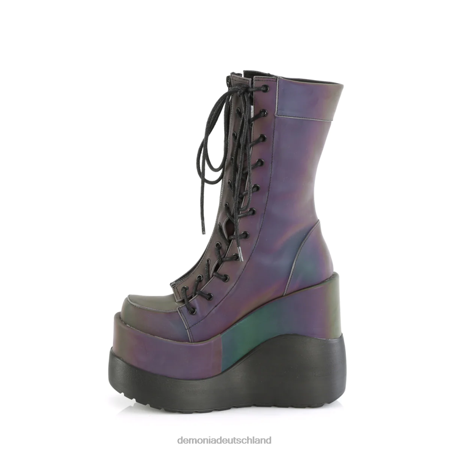 Mit den Void-118-Stiefeln steigern Sie Ihren Stil von Grund auf. Dieses Meisterwerk in der Mitte der Wade verfügt über einen 5-Zoll-Keilabsatz und eine geschichtete Plateausohle, die Ihrer Haltung einen unübersehbaren Schub verleiht. Mit einem aufwendigen Schnürdesign, das sowohl innen als auch außen umhüllt, ist es die sargförmige Zunge, die den Gothic-Charme perfekt macht. Die reflektierenden grünen Details sorgen dafür, dass Sie auch in den dunkelsten Ecken strahlen. Komfort trifft auf Coolness mit einem gepolsterten Kragen und einem praktischen Reißverschluss in der Mitte. Treten Sie hervor und stehen Sie aufrecht – void-118 ist Ihre Eintrittskarte für unverwechselbare Präsenz.