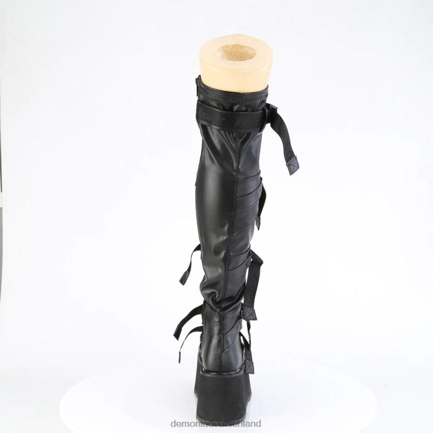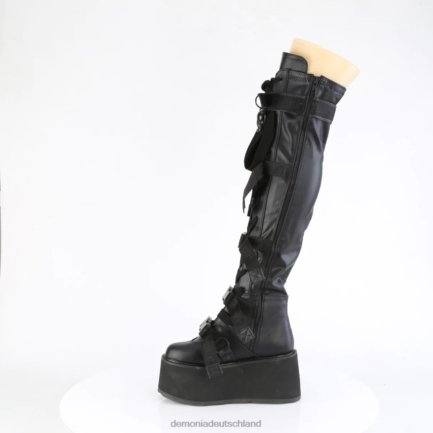 3 1/2 Zoll (90 mm) Plateau-Overknee-Stiefel zum Schnüren vorne mit Schnappschnallenriemen aus Nylon und mittigem Totenkopf-O-Rong auf der Vorderseite Riemen oben, Reißverschluss innen aus Metall