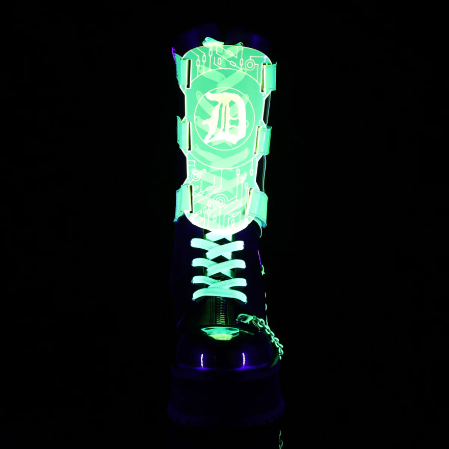 2 3/4 Zoll (70 mm) Plateau-Schnürstiefel mit mittelhoher Wade, Zehenkappe aus silberverchromtem Metall und UV-Schwarzlicht-reaktivem Acrylschutz mit Haness-Riemen und Pyramidenring- und Kettendetails, durchgehende Innenseite aus Metall
