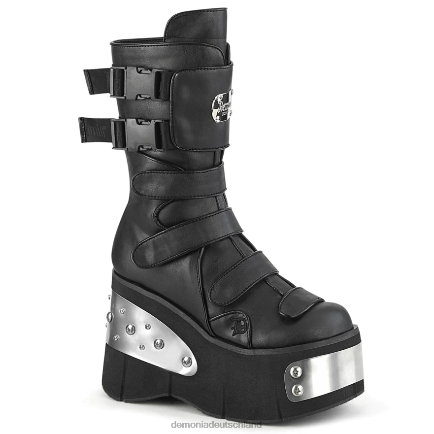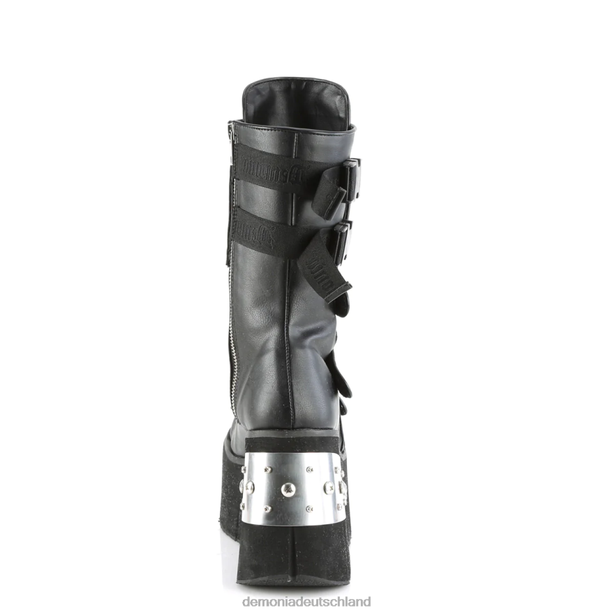 4 1/2 Zoll (114 mm) metallbeschichteter Plateau-Riemenstiefel in der Mitte der Wade vorne und hinten mit vorderem Schild mit gebrandetem Metallplättchen in der Mitte sowie zwei Schnappschnallen und Klettbändern an den übrigen Riemen.