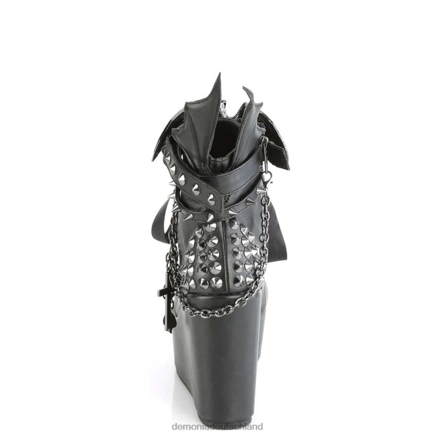 5-Zoll (127 mm) keilförmige Plateau-Stiefelette mit Schnürung vorne, umlaufenden Nieten- und Spike-Riemen mit Fledermausschnallen-Detail, Kette mit verschiedenen Anhängern zum Aufhängen und Fledermaus-Detail auf der Rückseite, innenliegender Metall-Reißverschluss