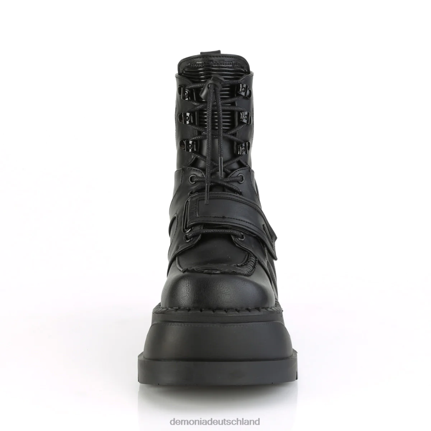 Bei den Stomp-13-Stiefeln trifft ausgefallenes Design auf unvergleichlichen Komfort. Diese aus hochwertigem schwarzem veganem Leder gefertigten Stiefeletten verfügen über eine beeindruckende 4 3/4-Zoll-Keilplattform für einen dramatischen Lift. Schnüren Sie es und sichern Sie Ihren Sitz mit dem praktischen Klettverschluss am Schuhblatt. Steppdetails auf der Vorderseite, der Zunge und der Rückseite verleihen diesen furchtlosen Stiefeln einen Hauch von Raffinesse, während der Schnürsenkelstopper der kühnen Ästhetik eine praktische Note verleiht. Stampfen Sie mit Stil, ohne Ihre Ethik zu gefährden.