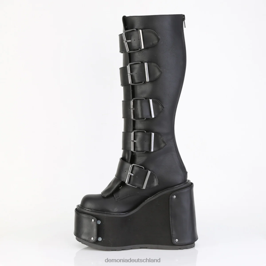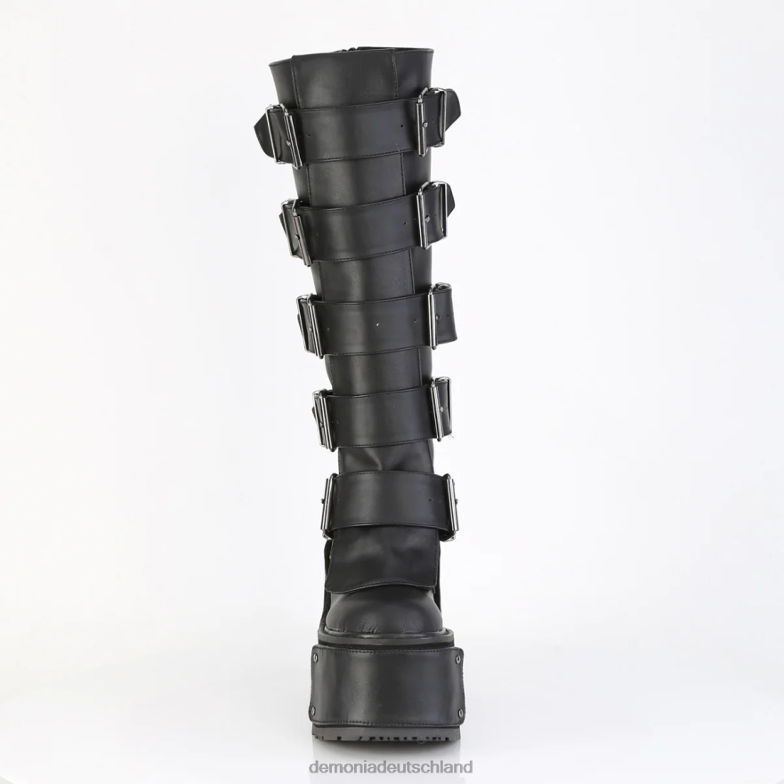 5 1/2 Zoll (140 mm) kniehoher Schnürstiefel mit keilförmigem Plateau und 4 austauschbaren Klettverschluss-Abdeckungen auf der Vorderseite und Schnürung in der Mitte mit flachem, flammenförmigem, Gummi-Nieten- und geprägtem Pyramiden-Nietenfeld