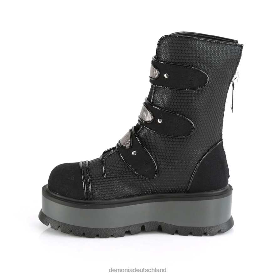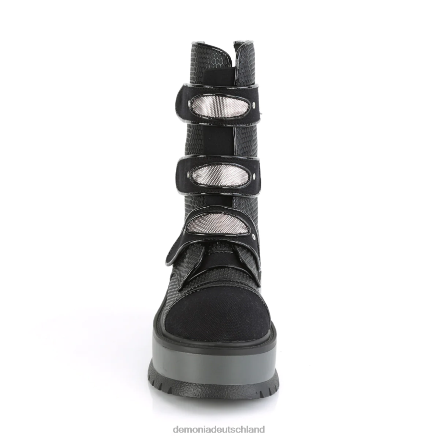 2 Zoll (51 mm) Plateau-Schnürstiefel in der Mitte der Wade vorne mit 3 Klettverschlussriemen mit Nieten und metallischen ovalen Details, hinterer Metallreißverschluss