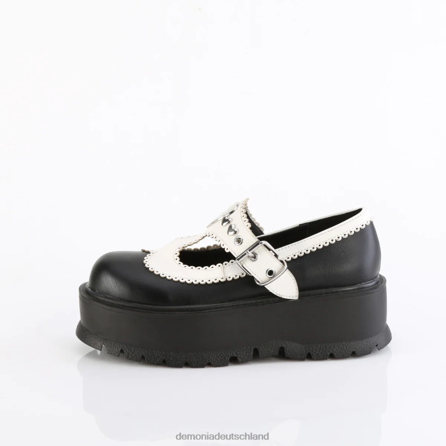 Setzen Sie ein Statement mit den Slacker-23 Maryjane-Schuhen. Diese Schuhe verfügen über ein 2-Zoll-Plateau und ein T-Riemen-Design, das mit Herznieten verziert ist. Die übergroße herzförmige Öse in der Mitte und die Muschelkantendetails verleihen dem Punk-inspirierten Stil einen Hauch von femininem Charme. Diese aus schwarzem und weißem veganem Leder gefertigten Schuhe sind perfekt für alle, die ein mutiges Statement setzen und gleichzeitig ethisch bewusst bleiben möchten. Schlüpfen Sie in diese Schuhe und verleihen Sie Ihrer alternativen Mode eine einzigartige Note.