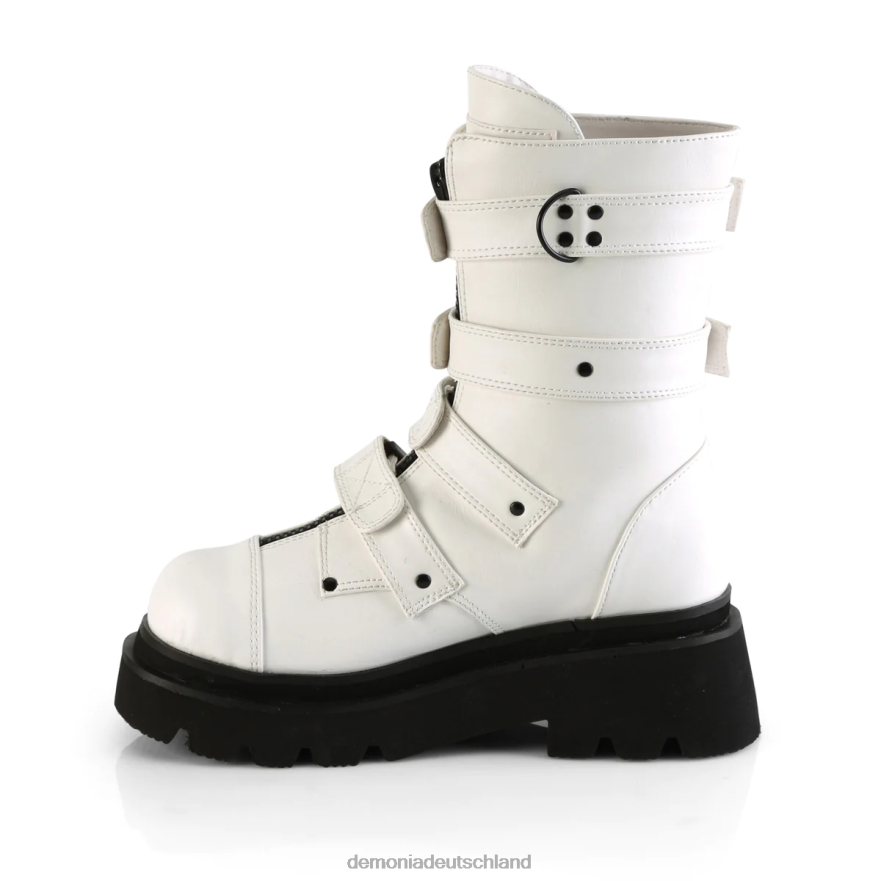2 1/2 Zoll abgestufter, wadenhoher Riemchenstiefel mit Plateausohle und Schnellverschlussriemen aus Kunststoff, Metallreißverschluss vorne in der Mitte