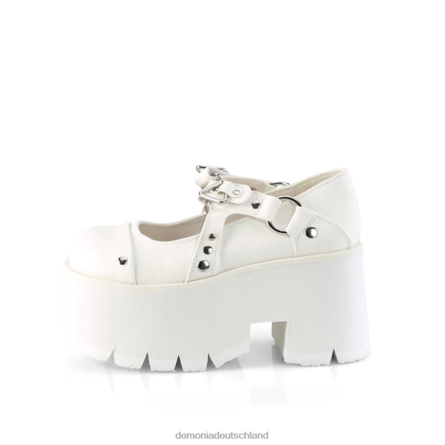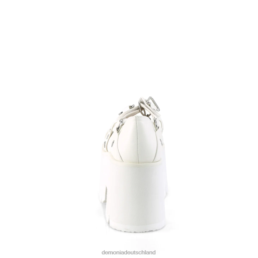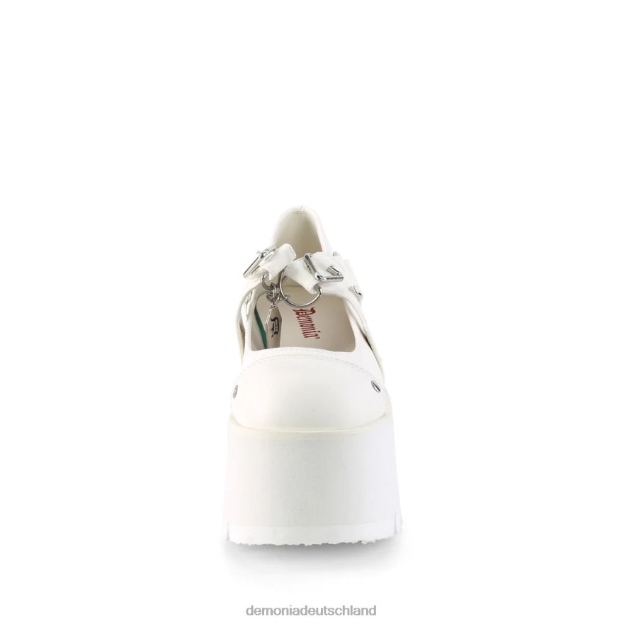 3 1/2 Zoll (90 mm) klobiger Absatz, 2 1/4'' (57 mm) ausgeschnittene Plateau-Maryjanes mit Klettverschluss, silbernen Nietenverzierungen am Obermaterial, Dreiecks- und O-Ring-Details und sargförmigem Anhänger am Mittelriemen