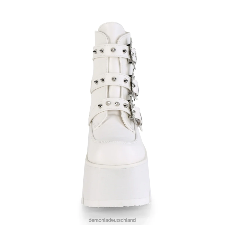 Siehe, die Asche-55 Stiefeletten, die perfekte Ergänzung für jede alternative Garderobe. Diese Stiefel verfügen über einen gewagten 3,5-Zoll-Blockabsatz und ein markantes 2,25-Zoll-Plateau mit Ausschnitten, die Ihrem Look das gewisse Etwas verleihen. Die drei fledermausförmigen Schnallenriemen, die perfekt mit Nieten besetzt sind, verströmen eine geheimnisvolle Atmosphäre, perfekt für alle, die sich von der Masse abheben möchten. Die auffällige weiße Farbe verleiht der klassischen Stiefeletten-Silhouette eine besondere Note und eignet sich perfekt zum Kombinieren mit Ihrem liebsten dunklen Denim oder Statement-Rock. Mit einer sicheren und bequemen Passform, dank der verstellbaren Träger und dem Reißverschluss an der Innenseite ist der Ashes-55 sowohl stilvoll als auch praktisch. Treten Sie stilvoll hervor und zeigen Sie Ihren mutigen und furchtlosen Look mit diesen unvergesslichen Stiefeln.