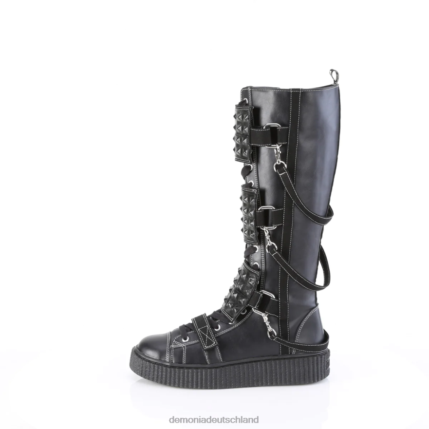 1 1/2 Zoll (38 mm) Plateau-Gummisohle, runde Zehenpartie, Schnürung vorne, kniehoher Creeper-Sneaker-Stiefel mit Klettverschluss, Nieten-geprägten Schildriemen, Riemendetails auf der Rückseite und Klettverschlussriemen auf der ganzen Seite p>